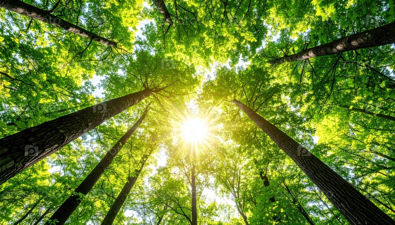 Солнечный свет, фильтрующий высокие деревья в густом зеленом лесу отражает концепцию силы природы, спокойствия и экологической устойчивости