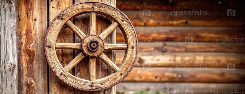 Старое деревянное колесо обозрения на рустической стене вызывает винтажный сельский образ жизни, исторические методы путешествий и эстетику западного наследия