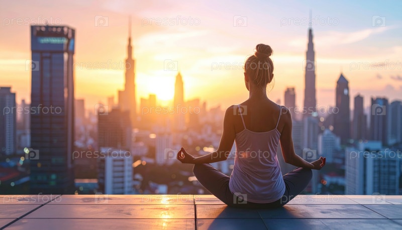 Женщина медитирует на рассвете на крыше небоскреба, представляя собой городскую осознанность, личное благополучие и внутренний мир в быстро развивающихся городах