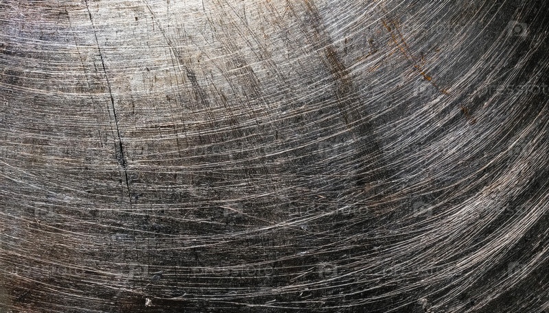 Близкий взгляд на сильно поцарапавшуюся металлическую поверхность с круглыми абразиями и легкими ржавыми пятнами