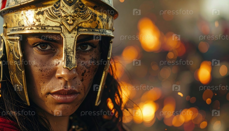 Женщина-воин, одетая в золотой шлем с яростным выражением лица во время боя, окружена пламенем и дымом
