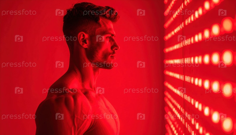 Мышечный мужчина стоит перед стеной терапии красным светом, представляя биохакерство, атлетическое восстановление и футуристические тренды в области оздоровления
