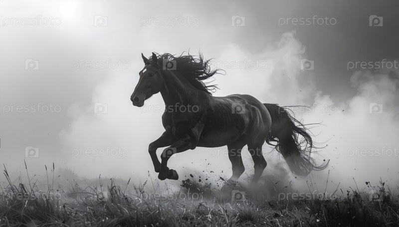 Черный конь, бегущий через туманное травянистое поле, запечатлен четко в черно-белом цвете