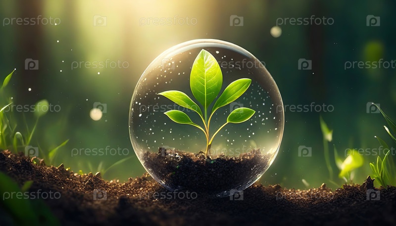 Молодое растение, растущее внутри стеклянного пузыря под солнечным светом, представляет собой концепцию экологического роста и устойчивости