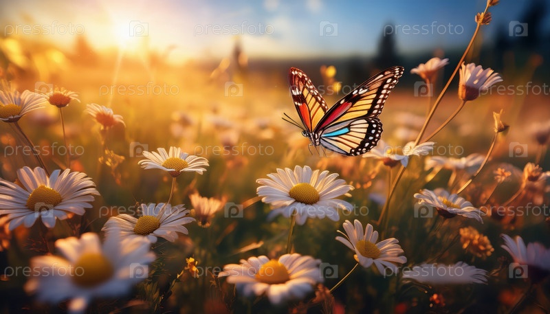 Близость бабочки-монарха на ромашках в золотой час в мечтательном естественном поле