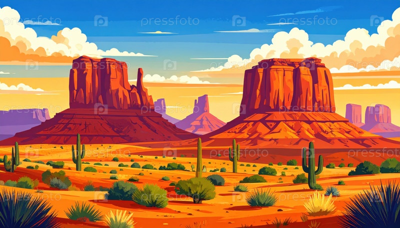 Пустынный ландшафт с красными скальными образованиями и кактусами, представляющими американский юго-запад, вдохновение для путешествий или концепция приключенческого путешествия