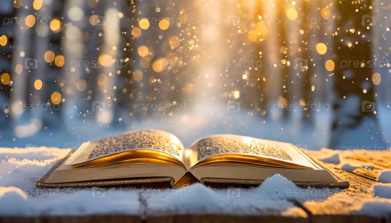Открытая книга в снегу, с солнечным светом, стекающим через заснеженный лес, создавая волшебную и мирную атмосферу