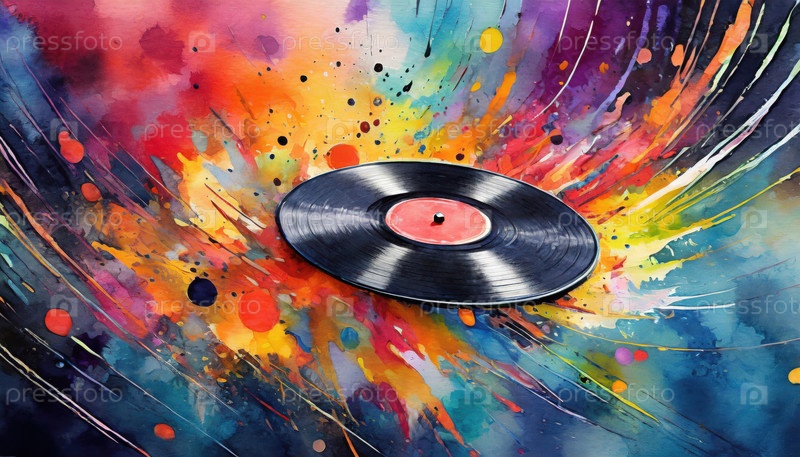 Виниловый диск вращается в волне яркого акварельного искусства, сливая ретро-музыкальную культуру с выразительным современным творчеством