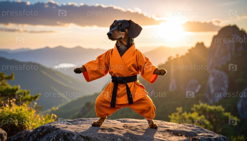 Щенок, одетый в мастера каратэ и позирующий на горе при закате солнца, символизирует решимость, дисциплину и странное личное расширение возможностей