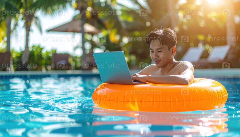 Мужчина использует ноутбук, плавая на оранжевом надувном кольце в бассейне тропического курорта в солнечный день