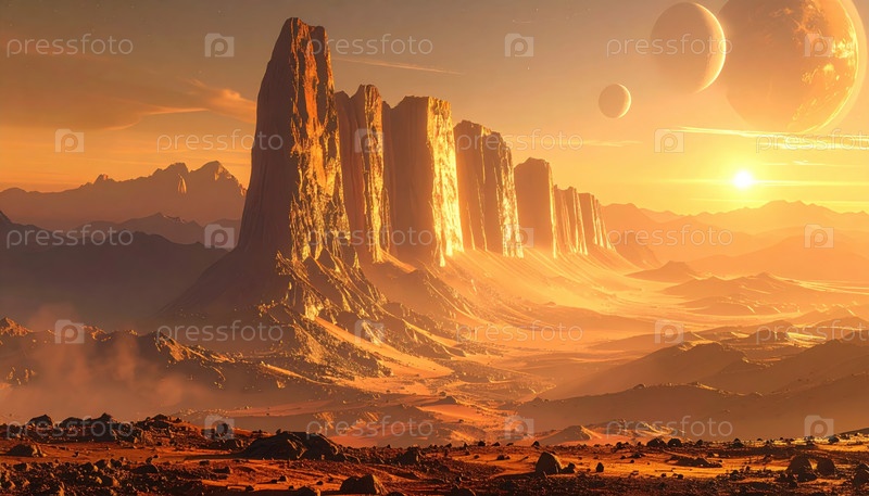 Инопланетный пустынный пейзаж с высокими скалами и несколькими планетами, видимыми в небе на закате