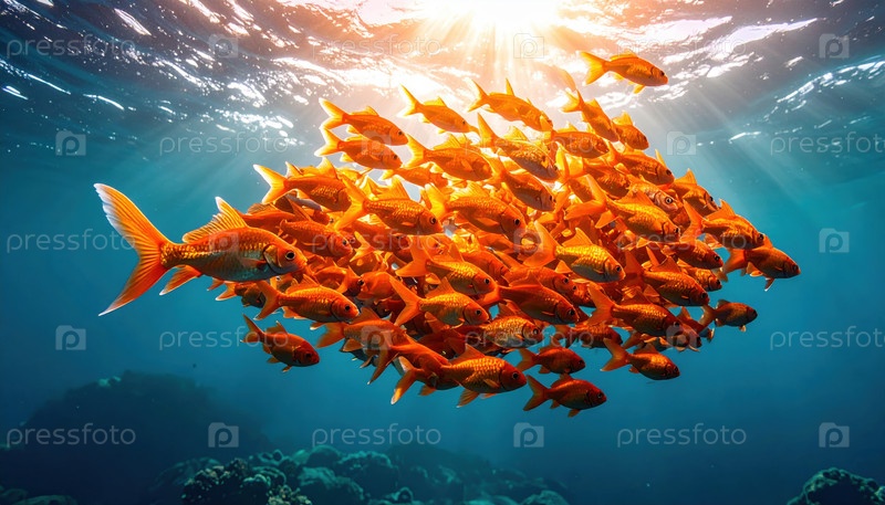 Живая школа рыб, плавающих в гармонии, пробуждающая единство, морское биоразнообразие, подводную фотографию и осведомленность о жизни океана