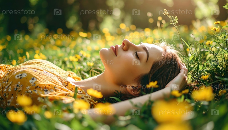 Женщина, лежащая на поле диких цветов, наслаждаясь природой и солнечным светом отражает самообслуживание, расслабление, здоровье и осознанность в современной жизни