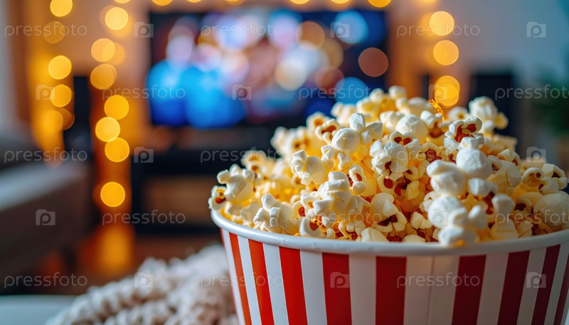 Полотенце с полосатыми попкорнами, заполненное сверху смазанными попкорнами в уютной обстановке домашнего кинотеатра со сказочными огнями