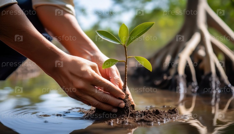 Руки аккуратно сажают молодые мангровые рощи в мелководье во время усилий по сохранению