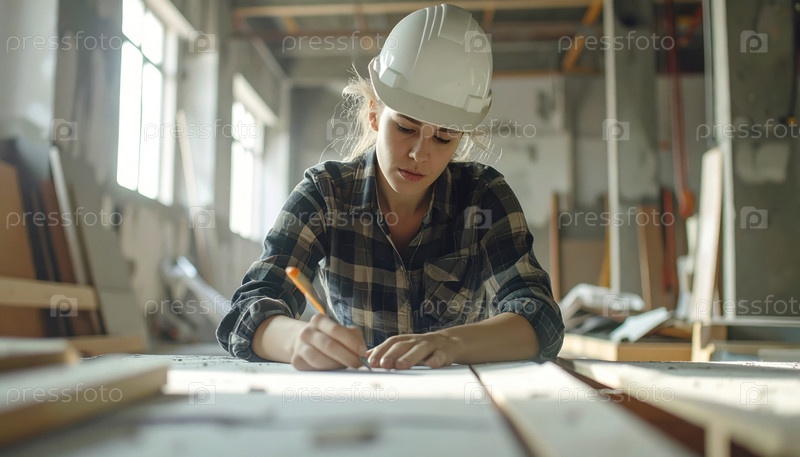 Молодая женщина-архитектор или инженер рисует эскизы на стройплощадке, символизирующие расширение прав и возможностей женщин и гендерное равенство в STEM и строительстве