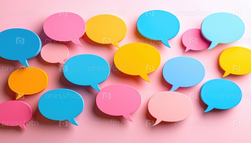 Красочные пузыри речи разбросаны на розовом фоне, символизируя общение, диалог, творчество и социальное взаимодействие в современной цифровой культуре