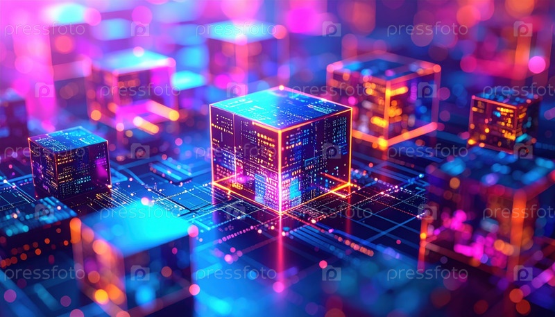 Цифровые кубики светятся в футуристической среде сети данных