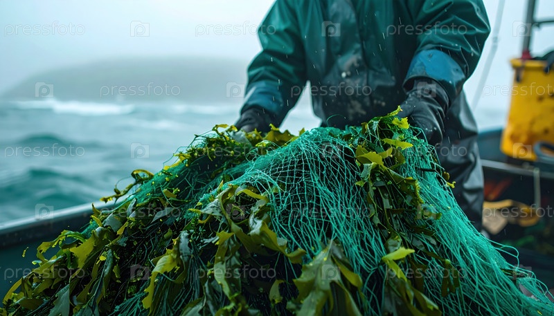 Рыбак собирает водоросли из сети во время туманного утра в океане, захватывая устойчивую аквакультуру в действии