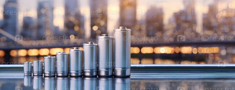 Серия металлических батарей, расположенных в порядке увеличения размера, установлены на фоне расплывчатого городского пейзажа при закате