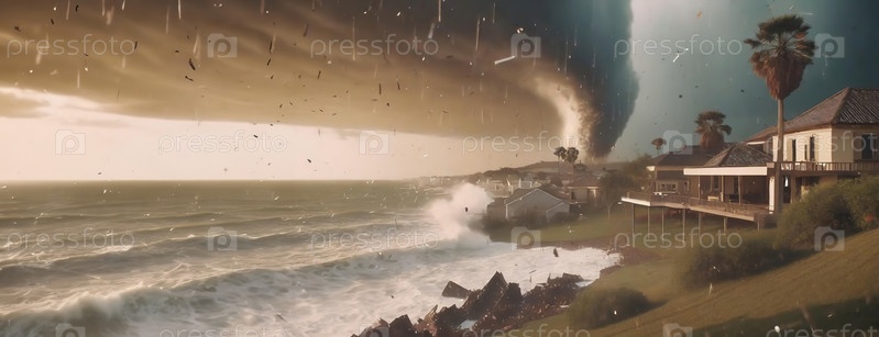 Над прибрежным домом висит торнадо, атмосфера напряжена надвигающейся опасностью. зловещее настроение ощутимое, захватывающее непредсказуемую силу природы над человеческим населением. Панорама с копировальным пространством