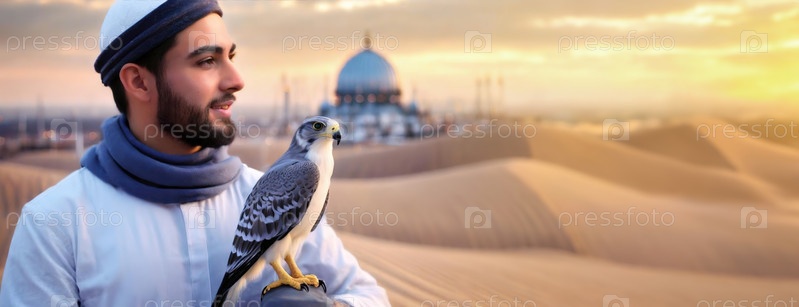 Человек с соколом наблюдает за пустыней на закате возле мечети.В конце концов, традиционный сокол стоит готовым, птица в руке, против огромных дюн и отдаленной священной структуры