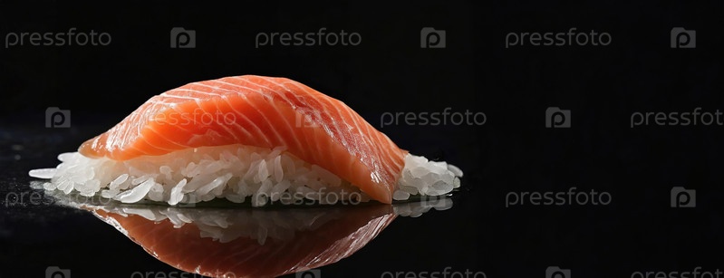 Нетронутый кусок лосося опирается на койку суши риса. Простота и вкус в одном укусе. Идеальный кусок сашими, представляющий свежесть и качество. Панорама с копировальным пространством