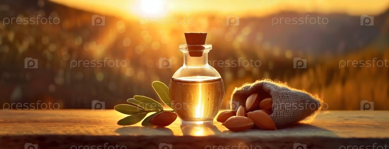 Стеклянная бутылка арганского масла согревается на закате, в окружении природы.Теплое солнце заходит позади холмов, освещая спокойную сцену собранных орехов и их побочных продуктов.Панорама