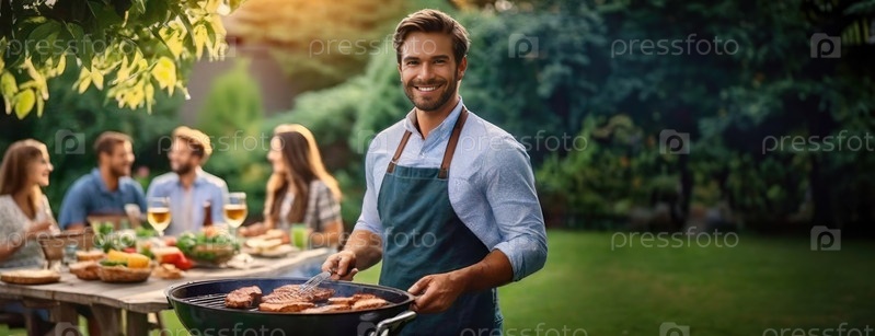 Тепло летнего барбекю проникает через него, когда мужчина жаждет друзей в саду. товарищество вокруг пламени гриля, когда смех и истории перемешиваются с свистящим приготовлением пищи