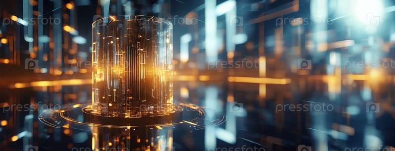 Светлое футуристическое ядро квантового компьютера, окруженное освещенными цифровыми шаблонами, представляющими энергию, данные и технологии в научно-фантастической обстановке