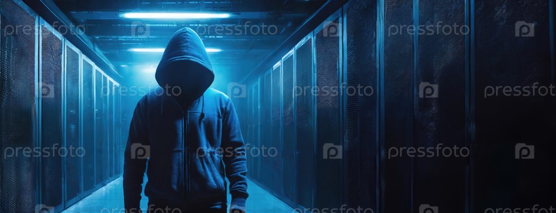 Фигура с капюшоном стоит в темной, синей серверной комнате и предлагает хакера в действии