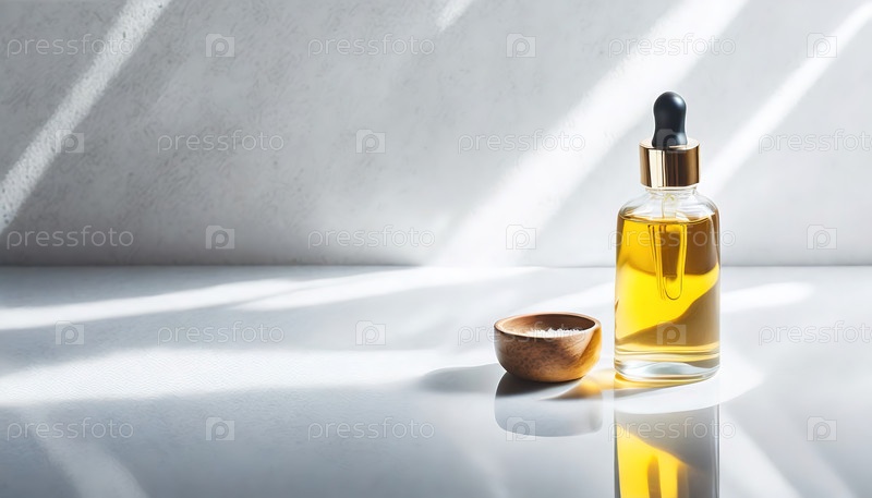 Стеклянная бутылка с маслом и деревянная чаша на белом столе под мягким естественным светом