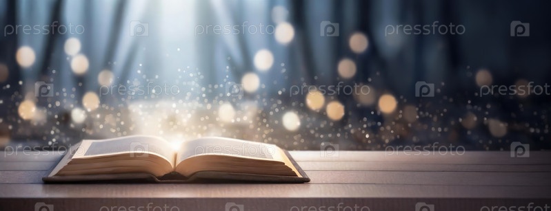 Открытая книга на деревянном столе с волшебными светящимися огнями и темным, размытым фоном, вызывающим чувство удивления, знания и фантазии