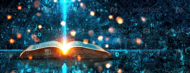Открытая книга с ярким светом, исходящим из ее страниц, в окружении футуристической цифровой атмосферы, представляющей силу знаний