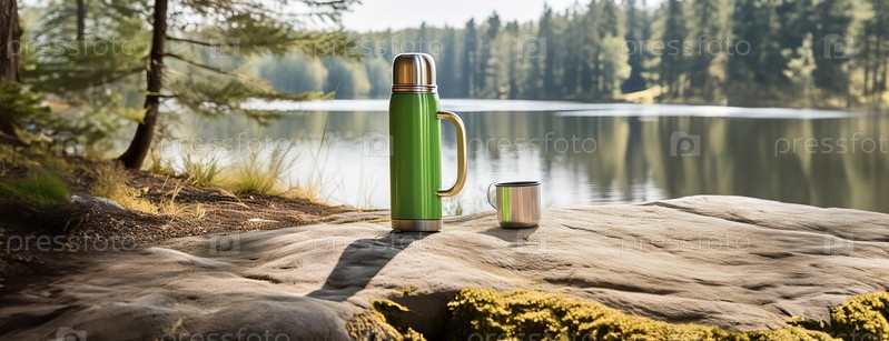 Зеленый термос и металлическая чашка расположены на скале у спокойного берега озера, окруженные соснами в солнечный день