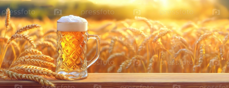 Октоберфест - это немецкий пивный фестиваль.Стекло пива со пеной сидит на деревянном обочине с видом на золотистое пшеничное поле во время захода солнца