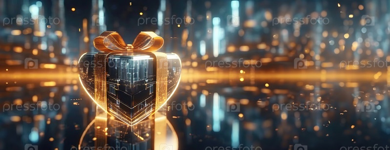 Концепция подарка с коробочкой в форме сердца в цифровом мире Мгновенные онлайн-покупки с использованием ИИ. Футуристический фон кибертехнологий. День святого Валентина. Панорама с копировальным пространством