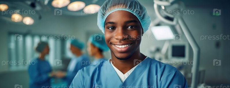 Улыбающийся хирург в комбинезонах готов к операции, надежда в его глазах. уверенность сияет сквозь него, представляя преданность и медицинскую экспертизу. Национальный день врачей. Панорама с копировальным пространством