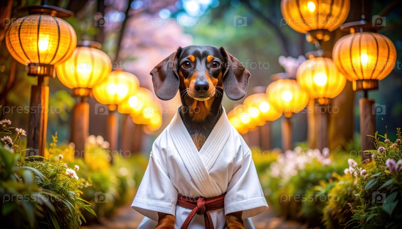Такс в форме боевых искусств, стоящий на освещенной фонариками дорожке, предлагающей темы дисциплины, юмора и культурного слияния