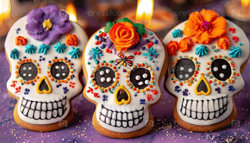Цветные печенье с сахарным черепом, украшенное для празднования Дня мертвых, отражает мексиканскую культуру, традиции и почтение к умершим