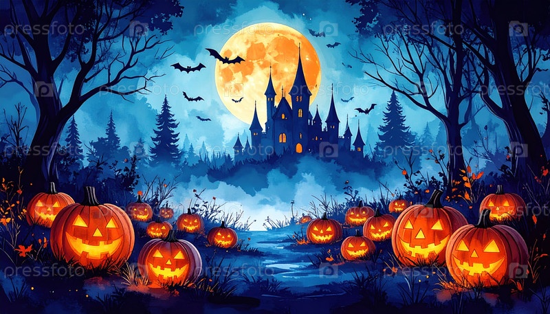 Фантастическая сцена Хэллоуина с фонарями, жутким замком, летучими мышами и полнолунием, вызывающая праздничную тайну и сезонный шарм