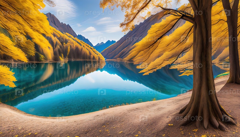 Безмятежное озеро, окруженное осенними деревьями и отражениями, представляет собой спокойствие осени, бегство от природы, сезонные изменения и мирные моменты путешествия