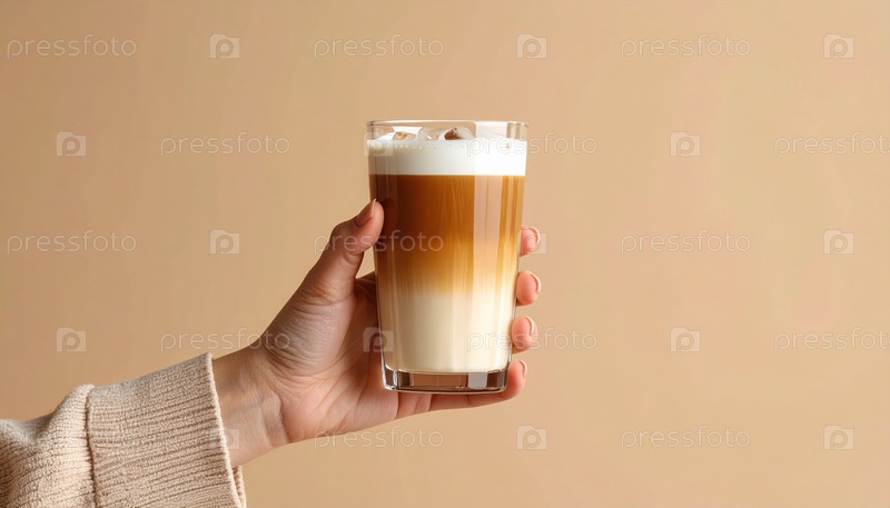 Рука держит ледяной латте с идеальным разделением слоев на минимальном бежевом фоне, представляющем эстетическую культуру кофе