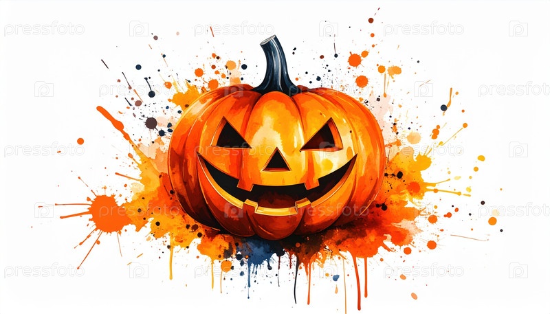 Яркая иллюстрация тыквы Хэллоуина с красочными спреями краски, символизирующей праздничное творчество и осенние каникулы