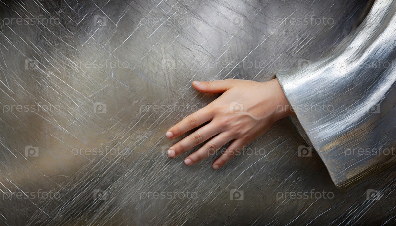 Рука человека, касающаяся царапины на металлической поверхности - это технологическое взаимодействие, футуристическая связь между человеком и машиной или научно-фантастические эмоции