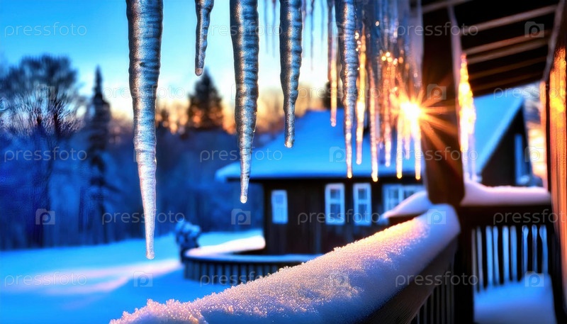 Ледники, висящие на крыше заснеженной хижины сверкают под золотым светом зимнего заката в отдаленном лесистом районе