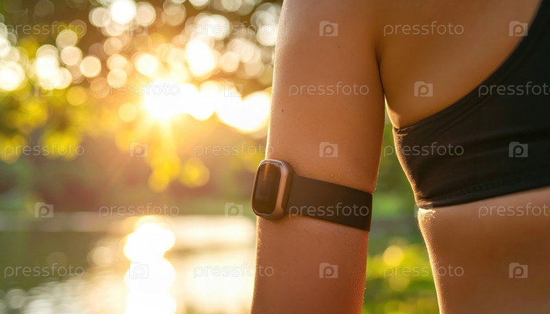 Правильный человек на улице, носящий интеллектуальный фитнес-трекер под теплым утренним солнцем, представляющий здоровье, отслеживание данных и активный образ жизни