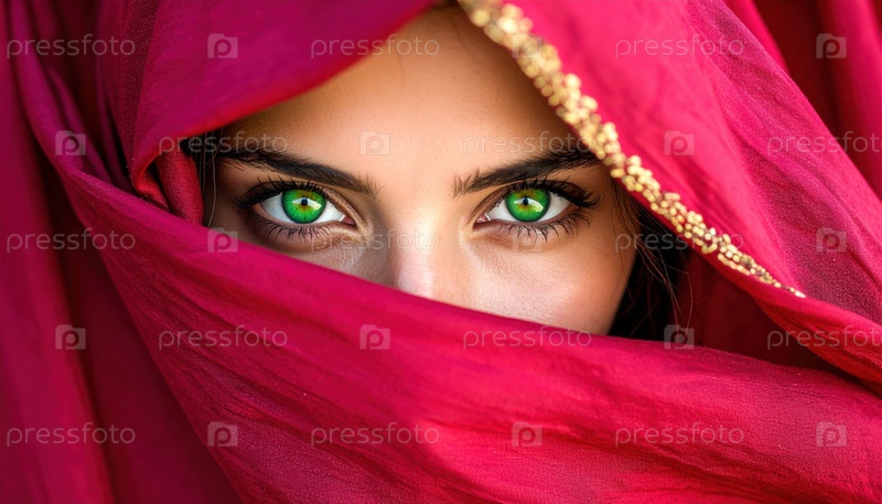 Таинственная фигура с ярко-зелеными глазами выглядит из-за красной завесы, вызывая темы скрытой идентичности, культурных традиций и нерассказанных историй