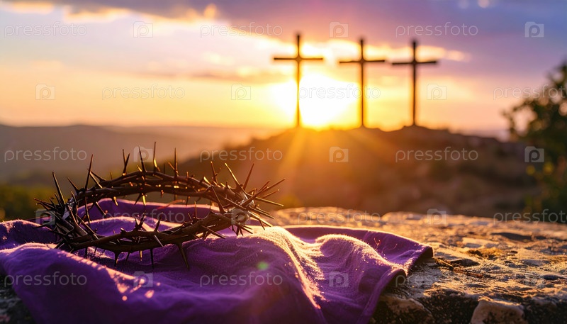 На фиолетовой ткани с тремя крестами, силуэтами на закате солнца лежит колючая корона, представляющая жертву, веру и послание Пасхи