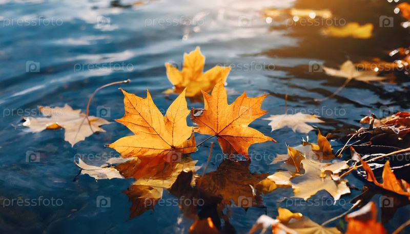 Осенние листья плавают на спокойной голубой воде, отражая мирный сезонный переход в природе, символизируя изменение и течение времени в конце октября